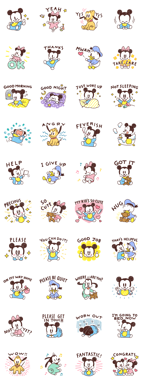 Comment: Mickey & Friends (Raising Babies). Mickey & Friends as adorable babies will soothe your soul! These stickers are here to warm the hearts of all those out there hard at work raising children.