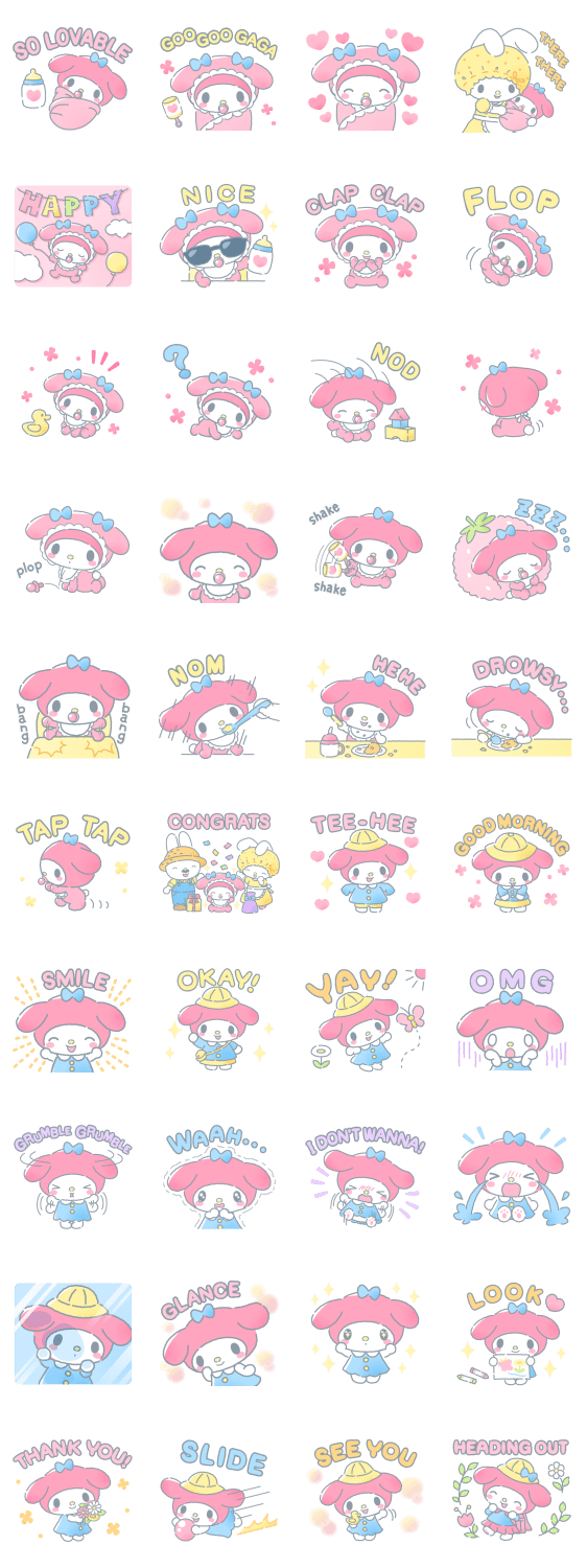 Comment: My Melody♪ Growing Quickly. My Melody's become a baby⁈ See My Melody growing up quickly with these wholesome stickers. She can now do so many things like laugh and cry.