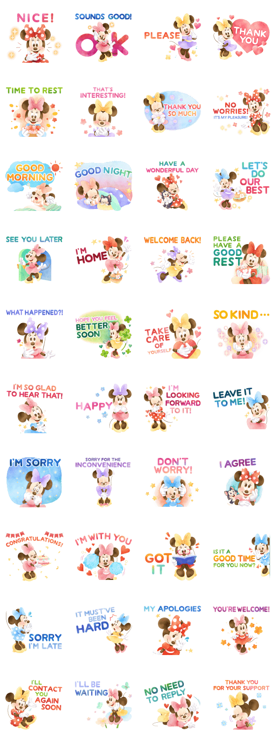 สติกเกอร์มินนี่ เมาส์ในสไตล์สีน้ำสุดละมุน! ข้อความสุภาพ อบอุ่นและอ่อนโยน เหมาะใช้พูดคุยในชีวิตประจำวัน♪