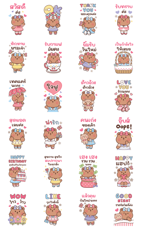 น้องหมีสีน้ำตาลกับชุดกระโปรงพาสเทล มาพร้อมคำพูดน่ารัก คำใช้ง่าย ใช้ได้ทุกวัน
