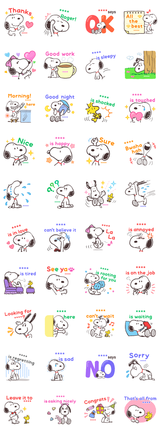 เปลี่ยนสติกเกอร์สนูปี้ในหลากหลายอารมณ์ให้เป็นสติกเกอร์ชุดพิเศษของคุณได้ง่ายๆ แค่ใส่ชื่อของคุณลงไปเท่านั้น สนุกกับการแชทด้วยสติกเกอร์สุดสเปเชียลได้เลย♪ กรุณาลองเติมคำในสติกเกอร์ก่อนซื้อเพื่อเช็คว่าคำนั้นจะแสดงบนสติกเกอร์อย่างไร เติมคำได้แค่ภาษาอังกฤษเท่านั้น หากใช้ภาษาอื่นอาจแสดงผลไม่ถูกต้อง