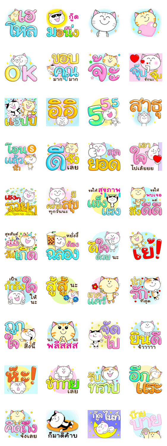ให้น้องแมว น่ารัก ที่มาพร้อม ตัวอักษรยักษ์ ตัวใหญ่ คำโต อ่านง่าย คำสุภาพ มาทักทาย ส่งความรัก กำลังใจ เชียร์ อวยพร ยินดี ส่งความห่วงใย ความสุข ให้แชทสนุก ทุกวัน