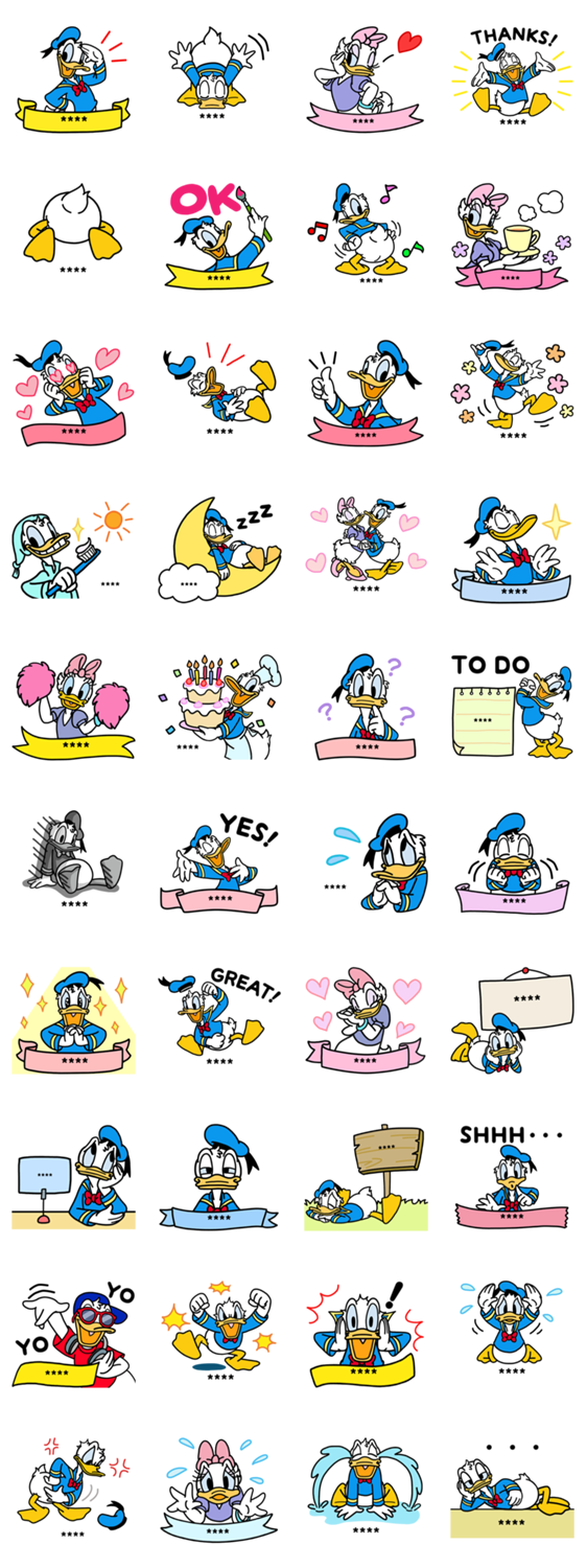 Comment: Donald Duck Custom Stickers. Donald Duck is back! Simply add your name to these stickers to give your chats a unique flair. These colorful stickers feature plenty of that trademark Donald Duck cuteness! Be sure to preview your caption before purchasing. Sticker captions are optimized for Western alphabets. Not all languages may appear correctly.
