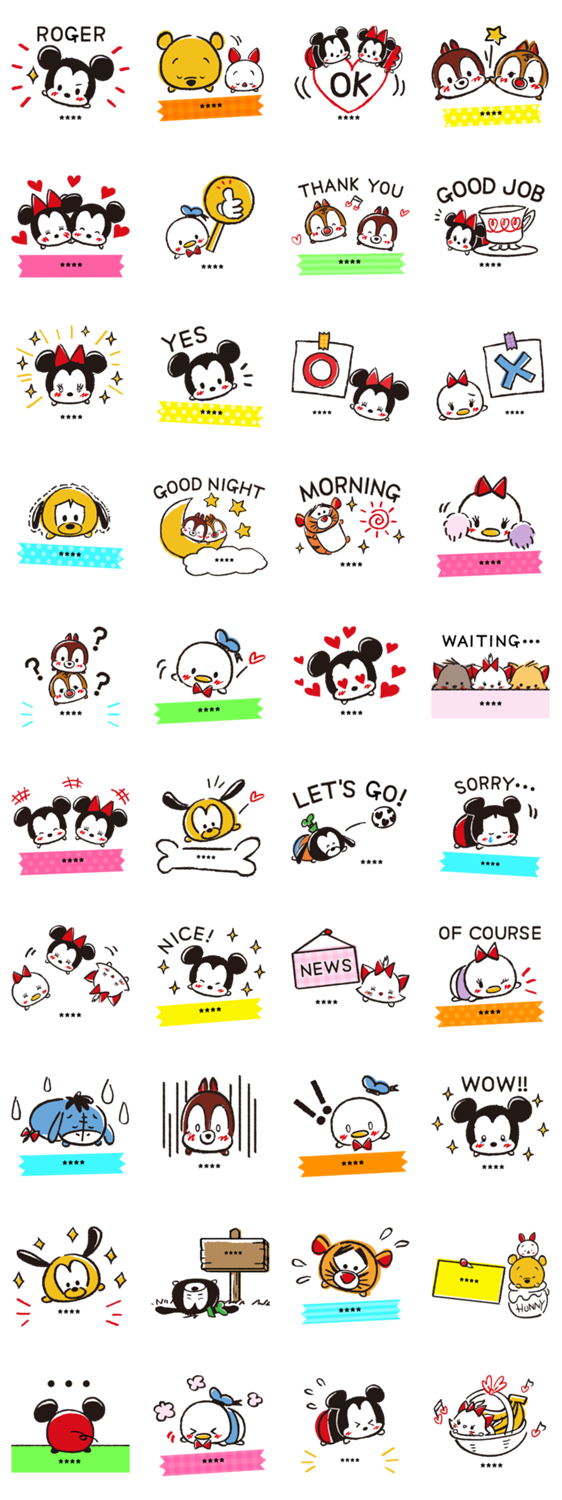 Comment: Disney Tsum Tsum Custom Stickers. The characters of Disney Tsum Tsum star in this set of custom stickersdesigned to give your chats a unique flair! The colorful masking tape adds an especially cute touch. Be sure to preview your caption before purchasing. Sticker captions are optimized for Western alphabets. Not all languages may appear correctly.