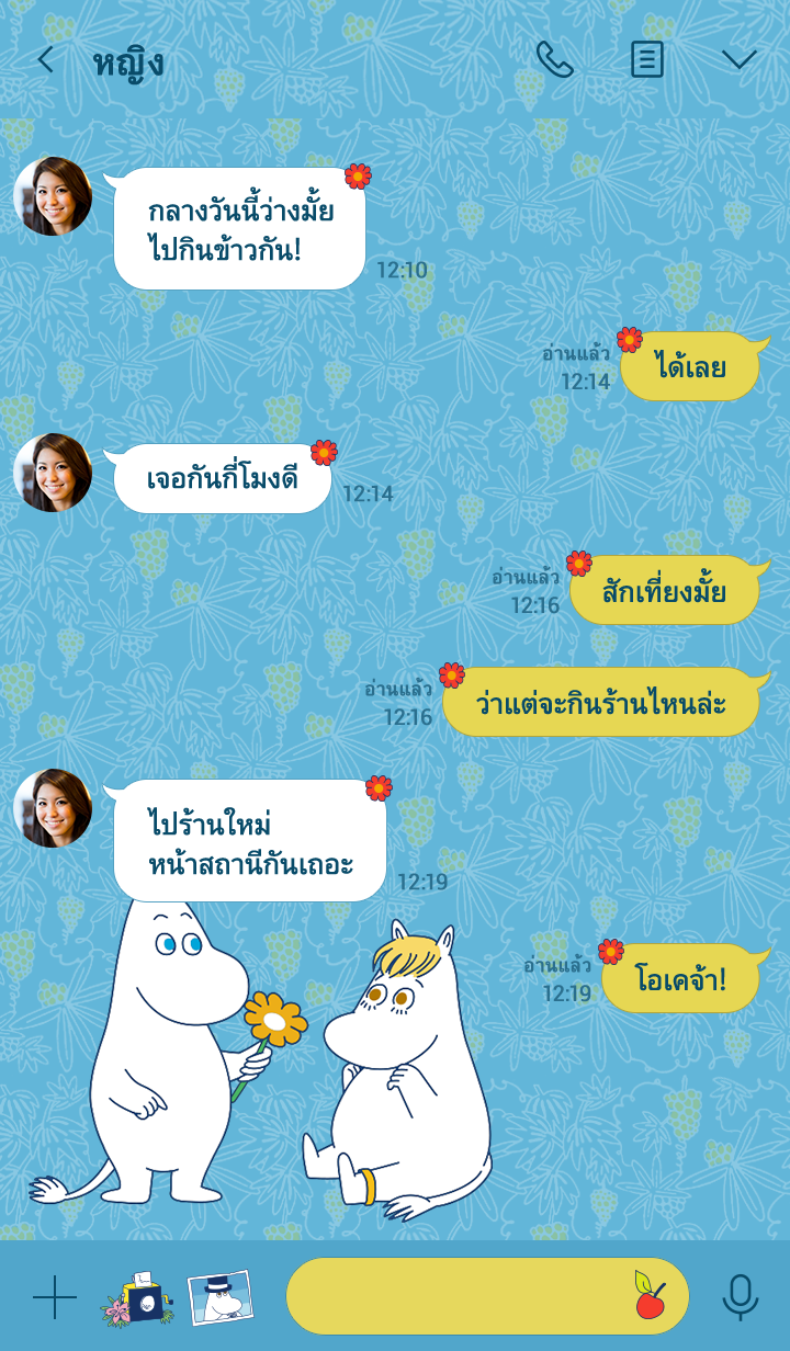 ธีมชุดใหม่จากมูมินมาแล้วจ้า วันนี้มีดอกไม้แสนสวยมาฝากคุณด้วยนะ ภาพพื้นหลังลายใบไม้ก็เก๋ไม่ใช่เล่นเลย * จะมีการอัพเดตธีมเป็นระยะจนถึง 180 วันหลังสิ้นสุดการจำหน่าย