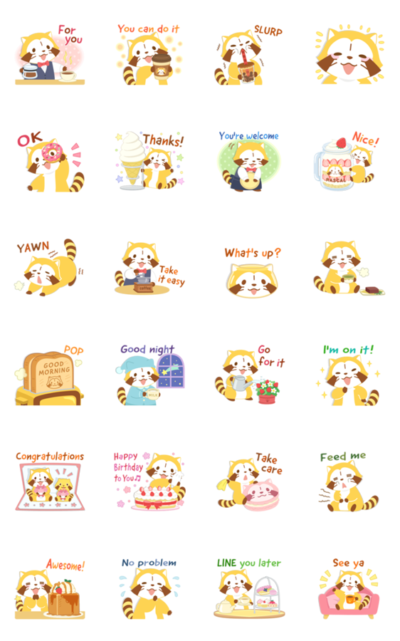 Comment: Rascal's Tea Time Stickers. This pop design theme is based on a super stylish cafe. These adorable stickers feature Rascal moving his way through all your chats, while the kindhearted messages are perfect for sending to friends and family.
