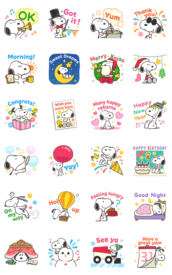 Comment: Snoopy Assorted Pop-Up Stickers. Get ready for some pop-up fun with Snoopy! With stickers for your daily chats as well as the winter holidays, this set has got you covered all year round. Say how you're feeling and say it big!