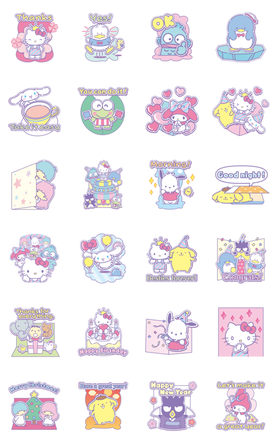 Comment: SANRIO CHARACTERS (Greetings). The cute characters from Sanrio return in this adorable greeting card set! These stickers are great for seasonal greetings or just saying how you're feeling.