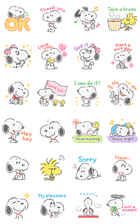 สติกเกอร์อนิเมชันจากสนูปี้ในรูปแบบลายเส้นสีเทียน นอกจากน่ารักแบบอ่อนโยนแล้วยังมีแต่คำพูดดีๆ ใช้ส่งให้เพื่อนๆ ได้ในหลายโอกาสเลยล่ะ
