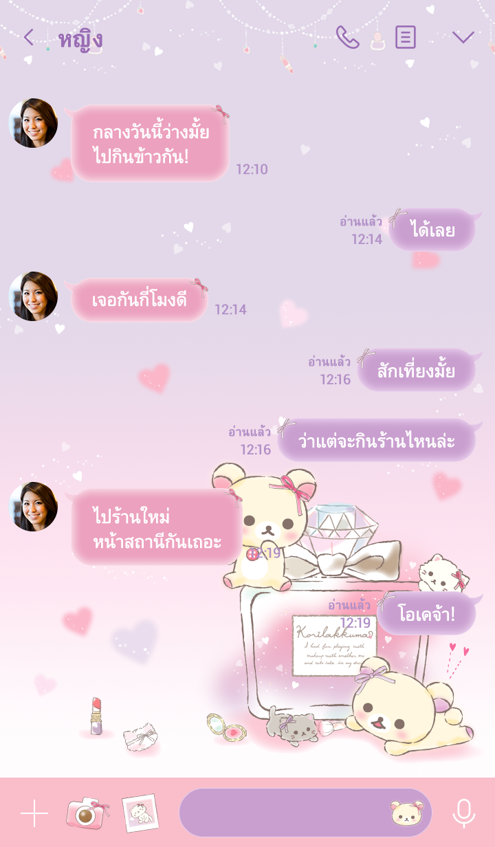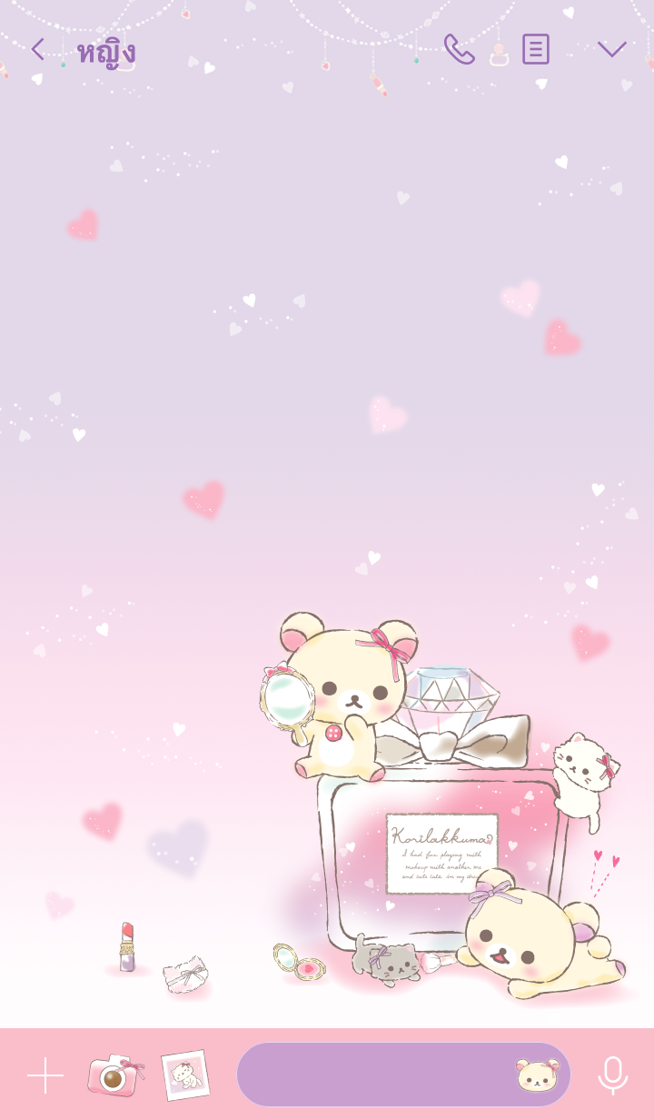 ทำไมวันนี้มี Korilakkuma 2 ตัว!?! แล้วยังแต่งหน้าทาปากสวยเชียว เปลี่ยนหน้าจอแชทของคุณให้เป็นโลกเก๋ๆ ของสาว Korilakkuma น้อยกันเถอะ♪ * จะมีการอัพเดตธีมเป็นระยะจนถึง 180 วันหลังสิ้นสุดการจำหน่าย