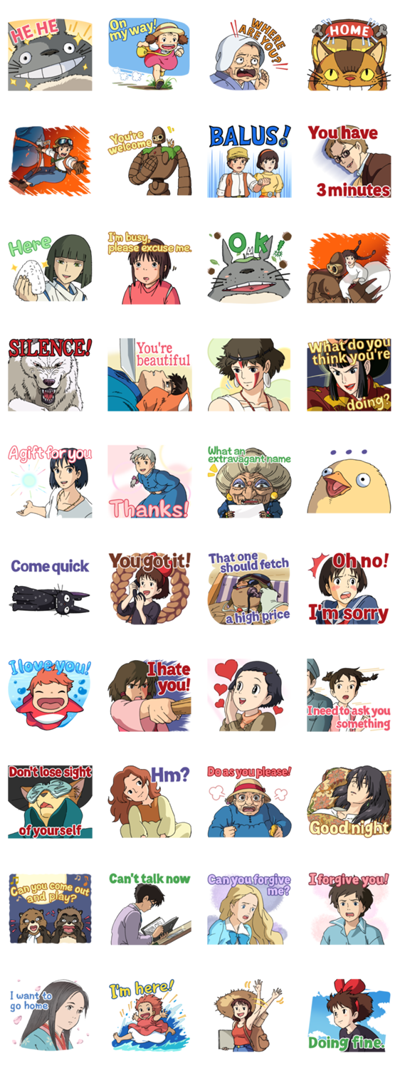 Comment: Everything Ghibli! Stickers. Get ready to be spirited away with this amazing sticker set featuring some of Studio Ghibli's most legendary characters! From everyday phrases to famous lines such as "Balus!" and scenes from Ghibli's beloved films, this set has got you covered.