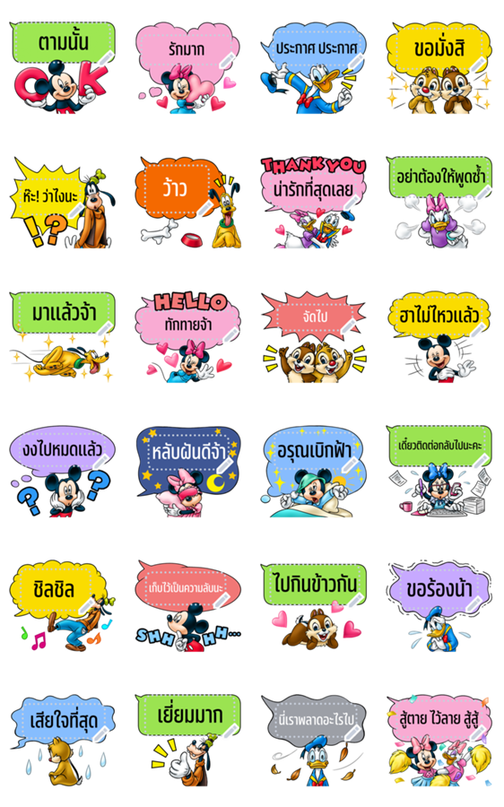 สติกเกอร์ข้อความจากมิคกี้เมาส์และผองเพื่อน พิมพ์อะไรก็ได้ตามใจคุณ ขณะนี้สติกเกอร์ข้อความสามารถใช้ได้ที่ห้องแชทใน LINE สำหรับสมาร์ทโฟนเวอร์ชัน 10.3.0 ขึ้นไปเท่านั้น โปรดตรวจสอบเงื่อนไขล่าสุดในการใช้งานที่หน้าช่วยเหลือ