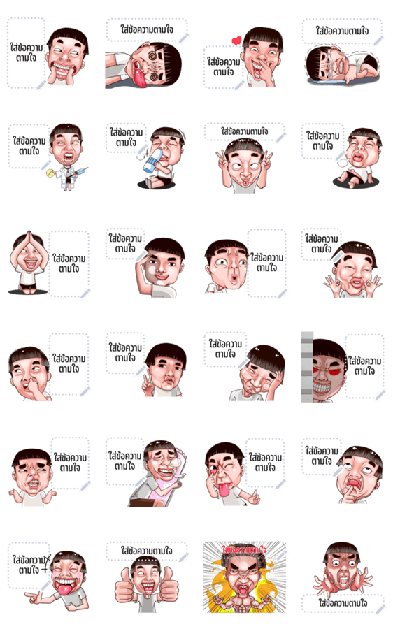 ใส่ข้อความตามใจ (ผมเป็น "คนตลก") ขณะนี้สติกเกอร์ข้อความสามารถใช้ได้ที่ห้องแชทใน LINE สำหรับสมาร์ทโฟนเวอร์ชัน 10.3.0 ขึ้นไปเท่านั้น โปรดตรวจสอบเงื่อนไขล่าสุดในการใช้งานที่หน้าช่วยเหลือ