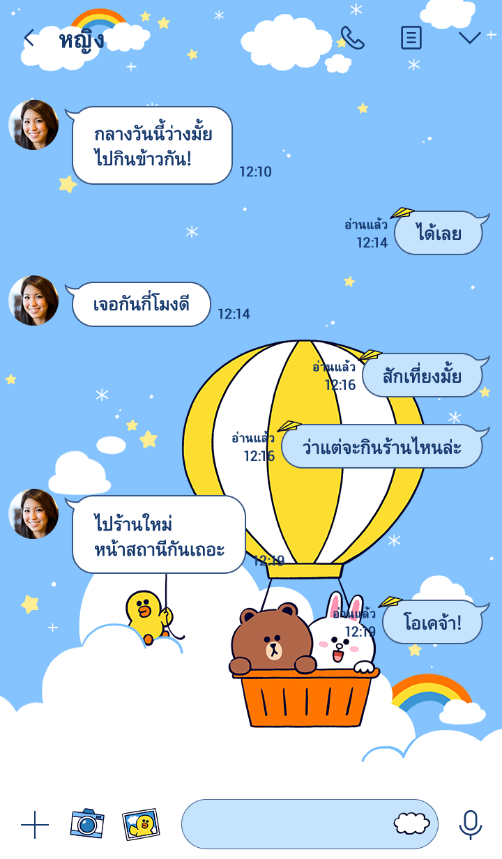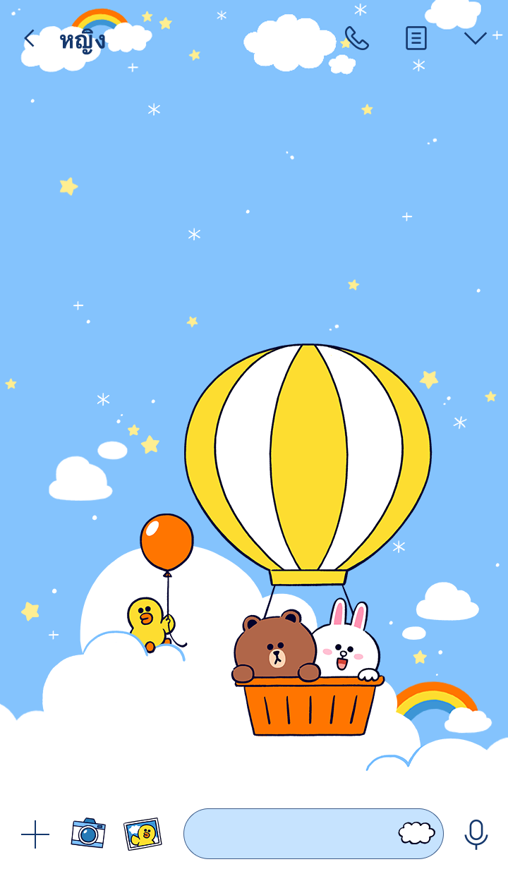 ธีมท้องฟ้าแสนน่ารักจาก BROWN & FRIENDS มาแล้วจ้า! แชทของคุณจะสนุกสุดเหวี่ยงไปกับบราวน์และเพื่อนๆ ที่กำลังนั่งบอลลูนกัน♪ * จะมีการอัพเดตธีมเป็นระยะจนถึง 180 วันหลังสิ้นสุดการจำหน่าย