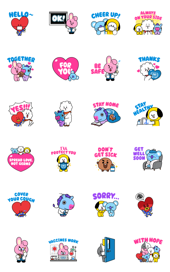 Comment: BT21: Protect You by LINE x IVI. "Be safe, stay healthy, and get well soon!" Teaming up with the International Vaccine Institute (IVI), BT21 characters show you easy tips on how to protect you and those around you from germs. Send BT21's heartwarming cheer-up messages to friends and support IVI to vaccinate the world. Available till October 31, 2020.