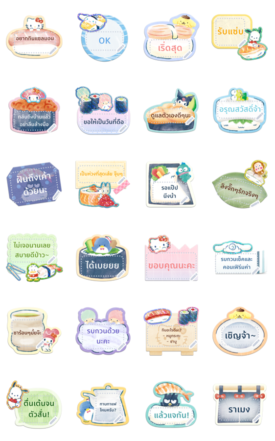 Comment: SANRIO CHARACTERS Memo Stickers. The Sanrio characters make sushi cute, and they'll make your messages even cuter! Write whatever messages you want to your friends and family. Message stickers currently require LINE 10.3.0 and above for smartphones, and only work in chats. Check the help page for the latest system requirements.
