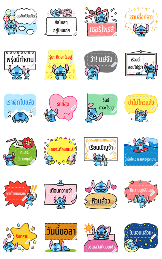 Comment: Stitch Message Stickers. The playfully mischievous Stitch returns with these message stickers that let you add your own custom text. Give your chats a cute and fresh new look with Stitch's comical expressions! Message stickers currently require LINE 10.3.0 and above for smartphones, and only work in chats. Check the help page for the latest system requirements.
