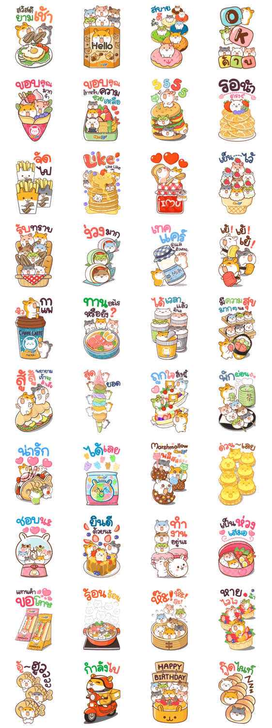 ตัวป่วนก๊วนแฮมซ่า มาซุกซนกับอาหารชวนทานทั้งนั้นเลย * บิ๊กสติกเกอร์จะแสดงในห้องแชทด้วยขนาดที่ใหญ่กว่าสติกเกอร์ทั่วไป
