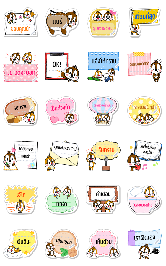 ชิป แอนด์ เดลจะมาสร้างสีสันให้แก่ข้อความของคุณพร้อมด้วยดีไซน์น่ารักน่าอ้อนสุดๆ! ขณะนี้สติกเกอร์ข้อความสามารถใช้ได้ที่ห้องแชทใน LINE สำหรับสมาร์ทโฟนเวอร์ชัน 10.3.0 ขึ้นไปเท่านั้น โปรดตรวจสอบเงื่อนไขล่าสุดในการใช้งานที่หน้าช่วยเหลือ