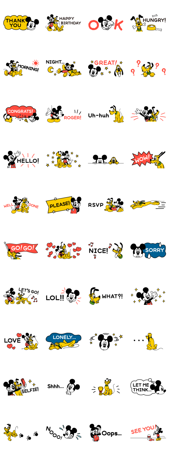 Comment: Mickey & Pluto Small Stickers. Mickey and his best friend are here, but a bit smaller than you remember! These stickers will get your message across without cluttering your chats. Everyone can have fun with these simple designs.