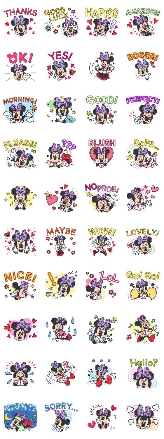 Comment: Minnie Mouse (Think Positive!). Minnie Mouse is bringing some positive energy to your chats! Fill your friends with optimism by using these stylish stickers.