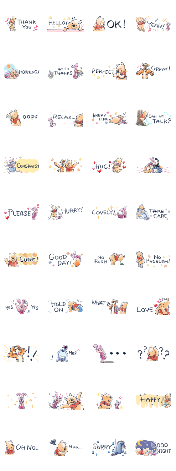 สติกเกอร์ลายเส้นสีน้ำจากหมีพูห์ที่ถึงจะมีขนาดเล็กแต่ข้อความชัดเจนอ่านได้ง่ายมาก มีแต่คำดีๆ เหมาะสำหรับการแชทอย่างสุภาพกับคนที่คุณนับถือ♪