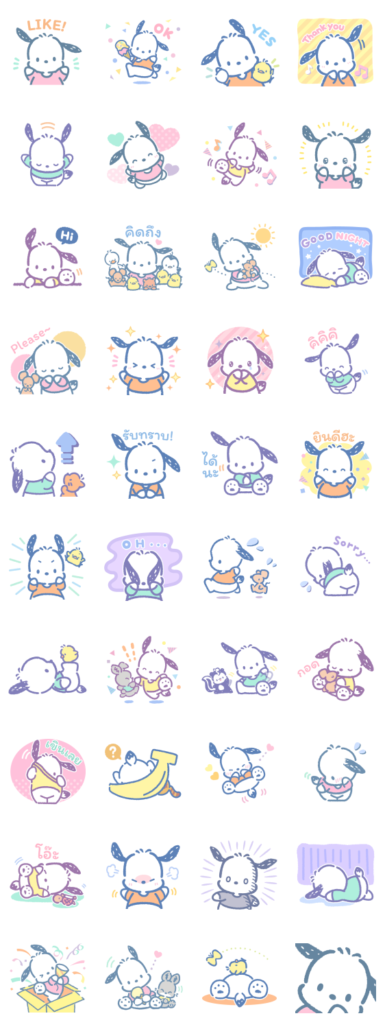 สติกเกอร์น่ารักของ Pochacco ผู้อยากรู้ไปหมดทุกอย่างและติดจะซุ่มซ่ามเล็กน้อย มีสติกเกอร์ที่ได้ใช้บ่อยในชีวิตประจำวันมากมาย แล้วยังมาพร้อมเพื่อนๆ เพื่อช่วยกันถ่ายทอดความรู้สึกแทนคุณอีกด้วย