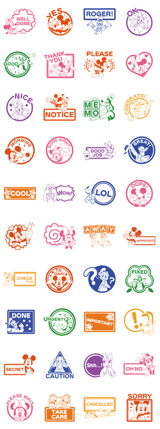 สติกเกอร์มิคกี้ เมาส์และผองเพื่อนในสไตล์ตราประทับ! จะคุยกับเพื่อนหรือคุยงานก็ประทับตราส่งได้ง่ายๆ สบายจัง!