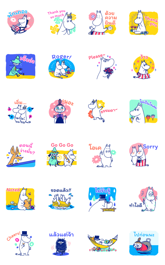 สติกเกอร์มูมินสีสันสดใสมาพร้อมข้อความรื่นหู ใช้ได้ทุกเวลาทุกสถานการณ์! ถ้าไม่รู้จะตอบแชทยังไง มูมินและเพื่อนๆ จะช่วยตอบให้แบบน่ารัก ซุกซนนิดๆ เล่นใหญ่หน่อยๆ เองจ้า♪