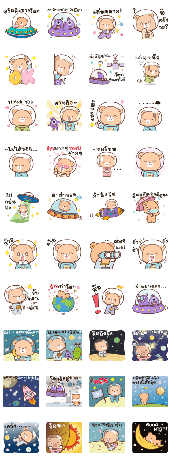 สติกเกอร์หมีน่ารักนักสำรวจ กับเพื่อนเอเลี่ยน มนุษย์ต่างดาว ท่องอวกาศ กาแลคซี่ จักรวาล กับคำพูดประจำวัน