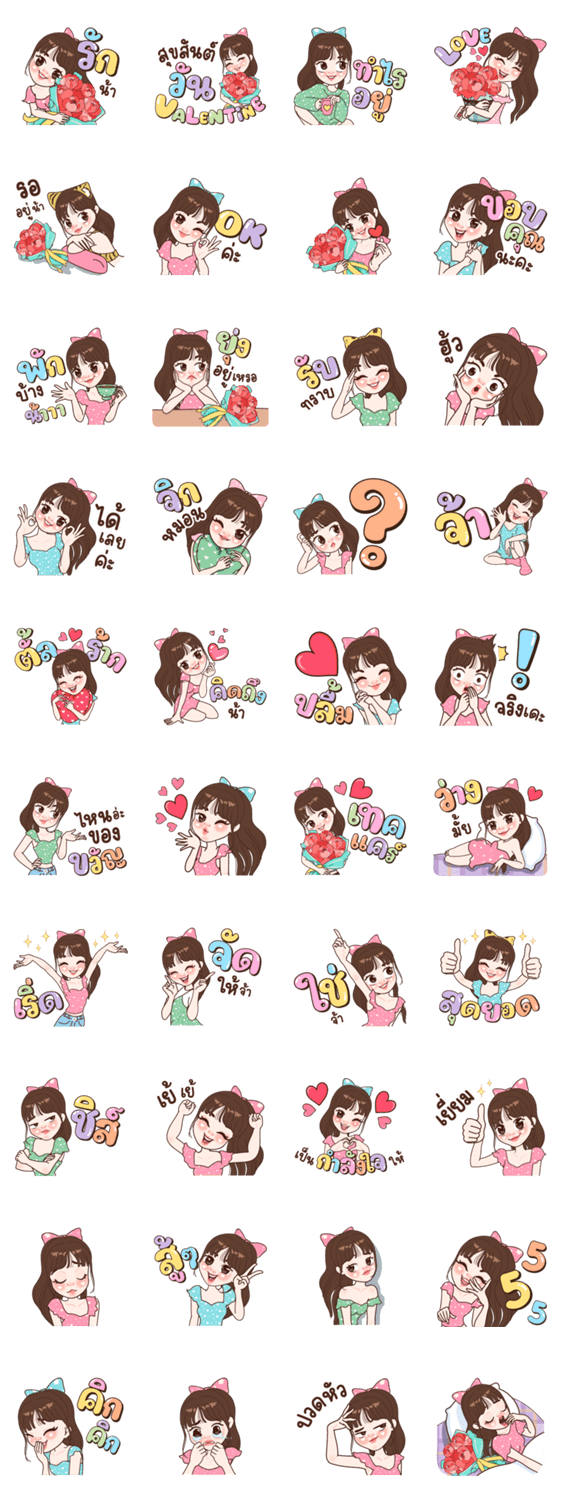 สุขสันต์วันวาเลนไทน์ ทำไรอยู่ เลิฟ รออยู่น้า โอเค ขอบคุณ พักบ้างน้า ยุ่งอยู่เหรอ รับทราบ คิดถึง ปลื้ม เทคแคร์ เริ่ด สุดยอด เยี่ยม เป็นกำลังใจให้ สู้ ปวดหัว