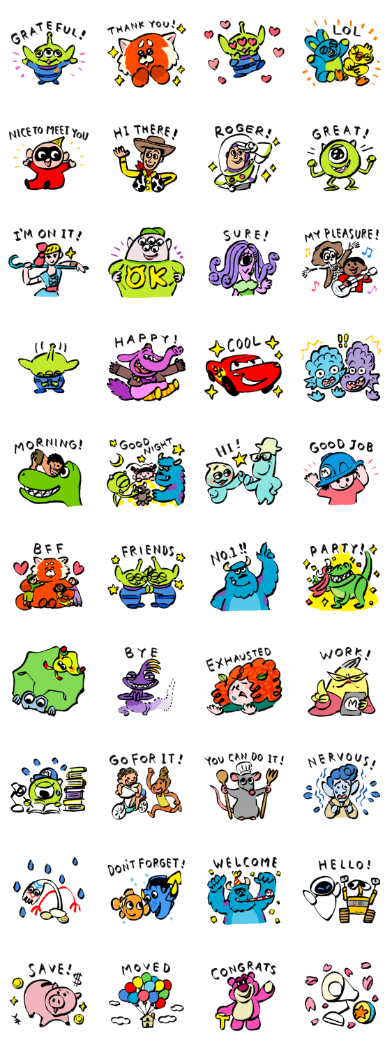 Comment: PIXAR Spring Stickers. All the big PIXAR hits are here! This sticker set is filled with your favorite characters as well as newcomers from the movie Turning Red. Use them to bring some pizzazz to your chats!