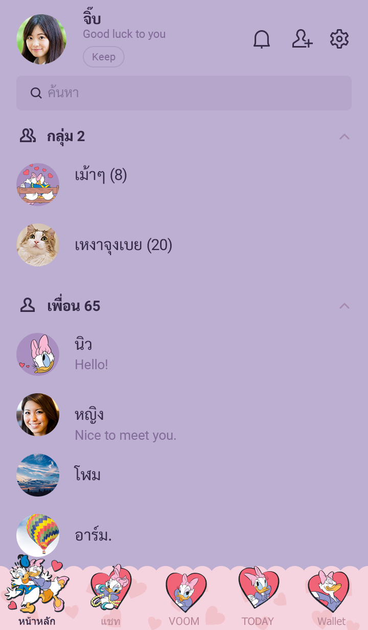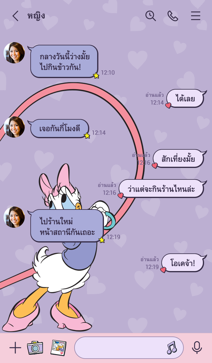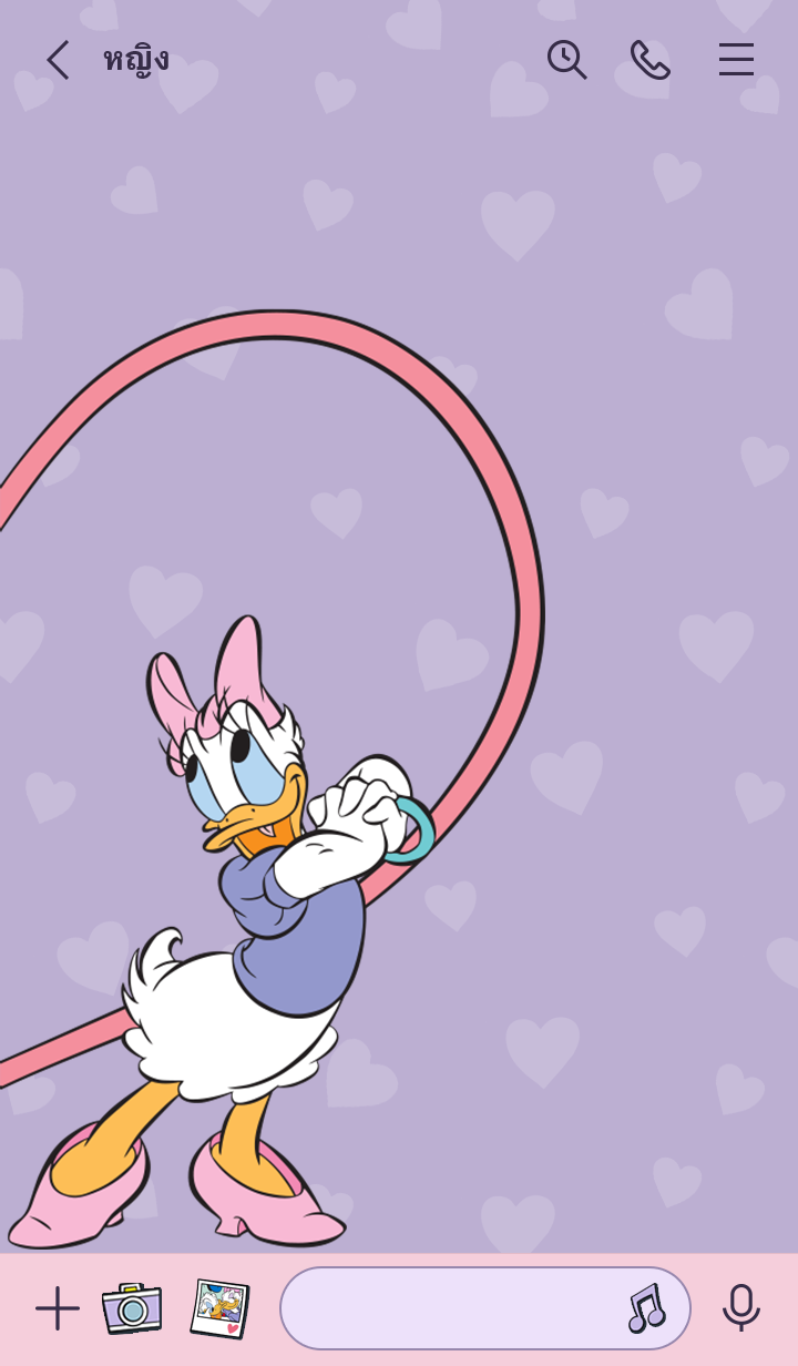 โดนัลด์ดั๊กกับเดซี่ดั๊กควงแขนกันมาในธีมดีไซน์คู่กัน! ใช้สองคนแล้วเอาหน้าแชทมาต่อกันได้ด้วยนะ♪ (จะมีการอัพเดตธีมเป็นระยะจนถึง 180 วันหลังสิ้นสุดการจำหน่าย)