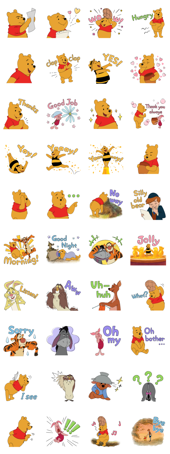 Comment: Winnie the Pooh Whimsical Stickers. Winnie the Pooh comes to you in a set of stickers that look just like an animated film. Pooh and friends are bursting with energy, and they're ready to bring some smiles to your chats!
