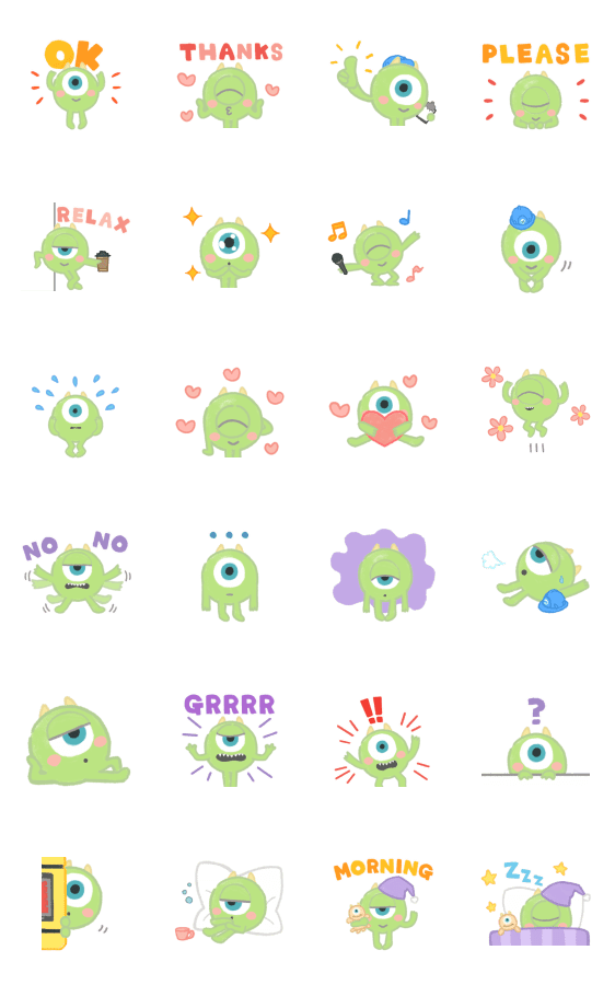 ไมค์จาก Monsters, Inc. มาพบคุณในสติกเกอร์ดุ๊กดิ๊กนุ่มตาน่ารัก เห็นไมค์ขยันและตั้งใจขนาดนี้ คุณต้องมีแรงทำงานเพิ่มขึ้นอย่างแน่นอน!