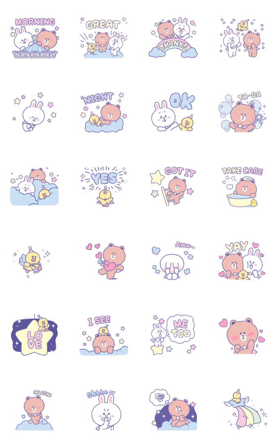 Comment: LINE FRIENDS Shining Stars. The LINE FRIENDS invite you to the starry sky in this fairy-tale sticker set. Make your chats sparkle!
