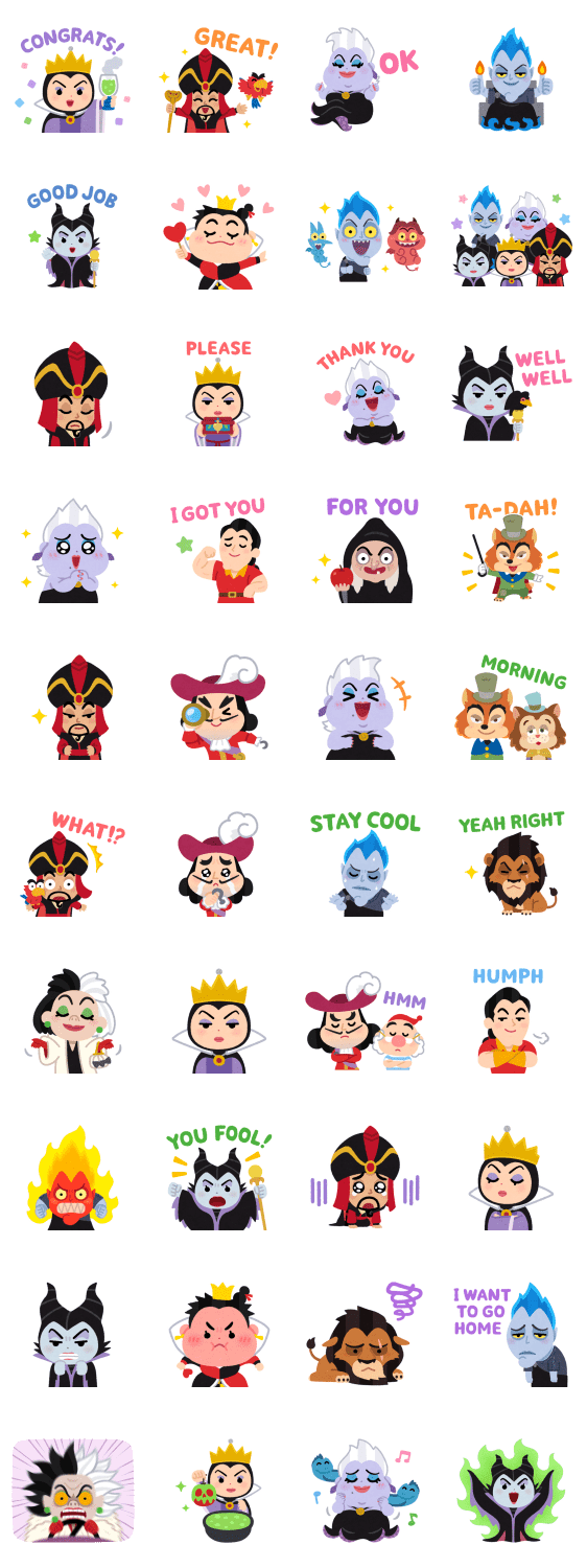 Comment: Disney Villains by Takashi Mifune. Irasutoya brings you a set of illustrations featuring Disney's iconic villains! Their many expresions will bring a devious energy to your chats.