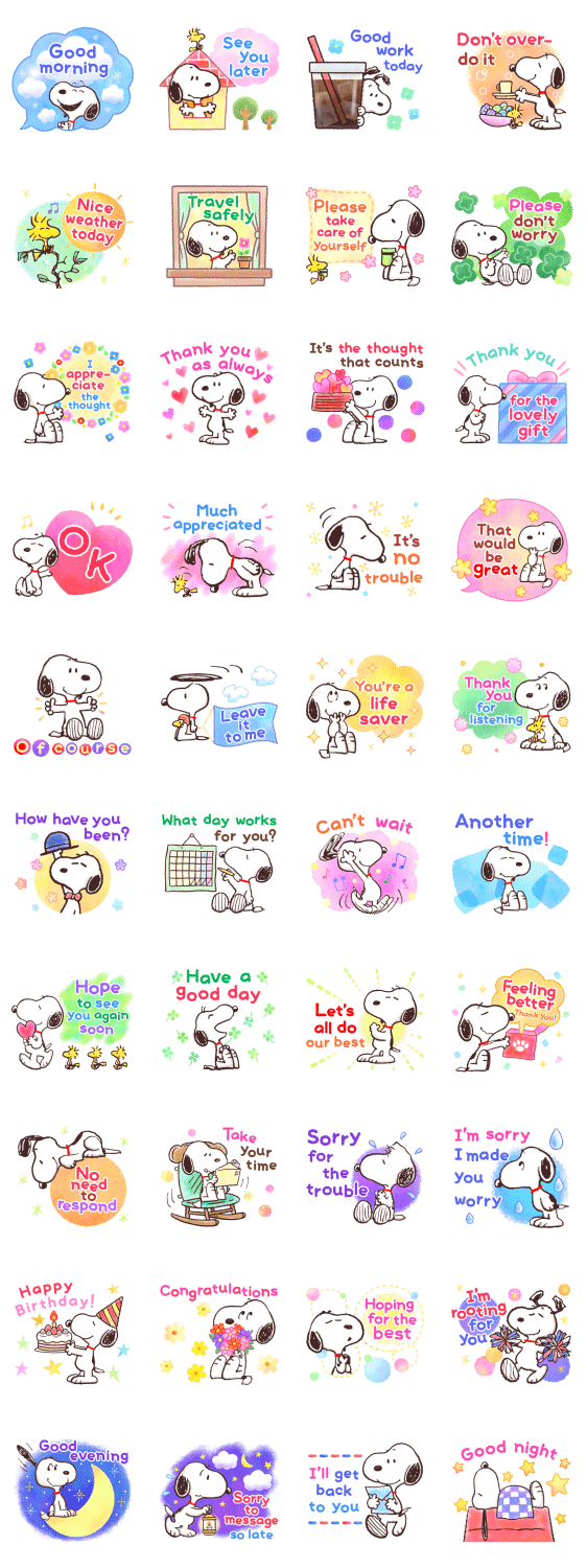 Comment: Considerate Snoopy for Grown-Ups. This sticker set is full of considerate and polite phrases that grown-ups can use! These versatile stickers can be sent to anyone and used anywhere.