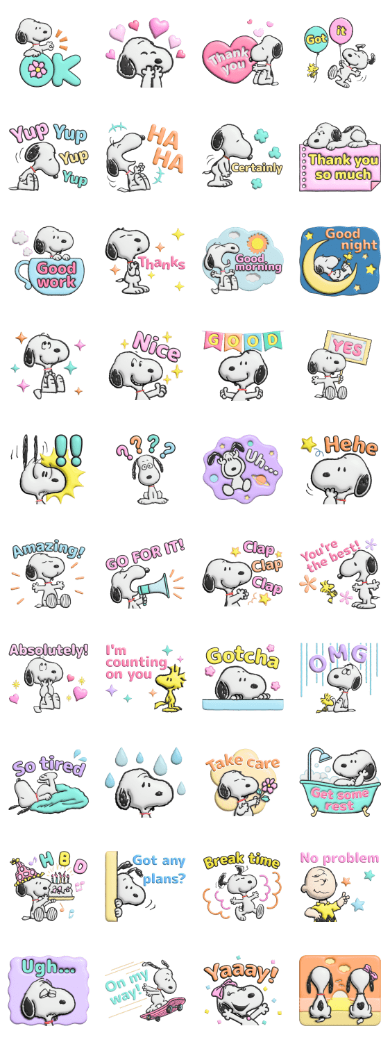 สติกเกอร์นุ่มนิ่มมีมิติจาก Snoopy มาแล้ว♪ รวมคำที่ได้ใช้บ่อยในชีวิตประจำวัน ใช้งานง่ายมากเลย