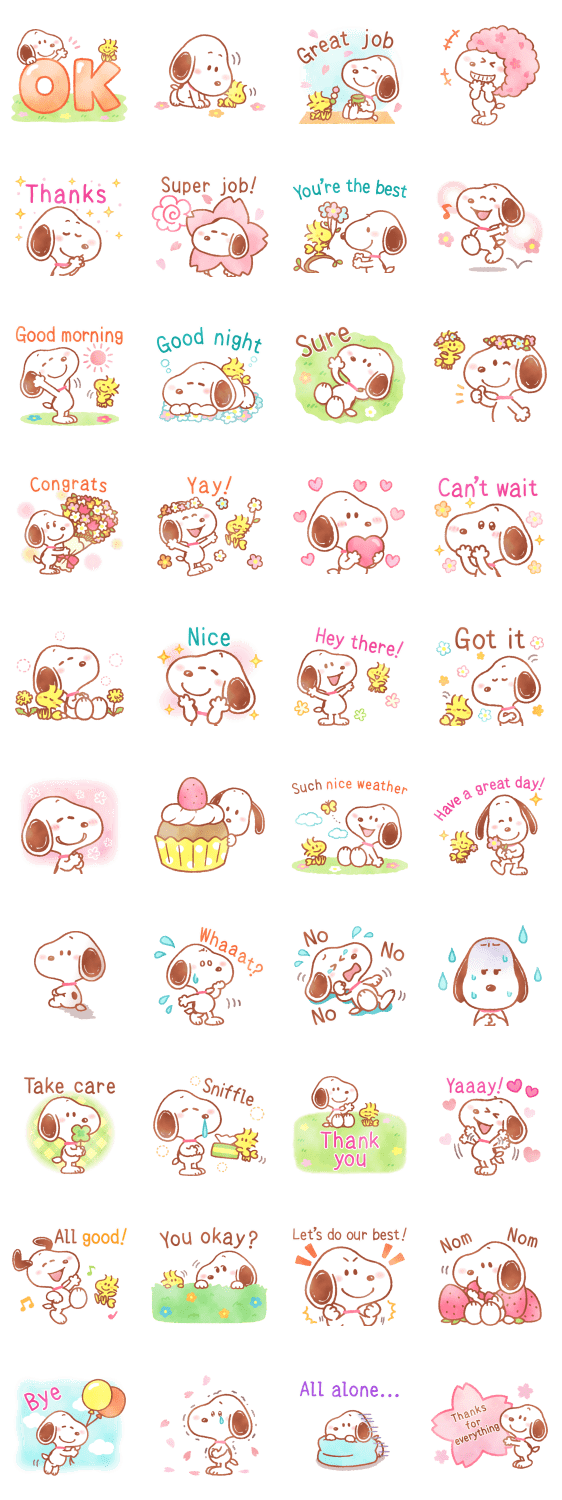 Comment: Lovely Snoopy (Warm Spring). These stickers are perfect for a warm and sunny spring. Snoopy is relaxed and adorable! Use these for spring events or just during your everyday conversations.