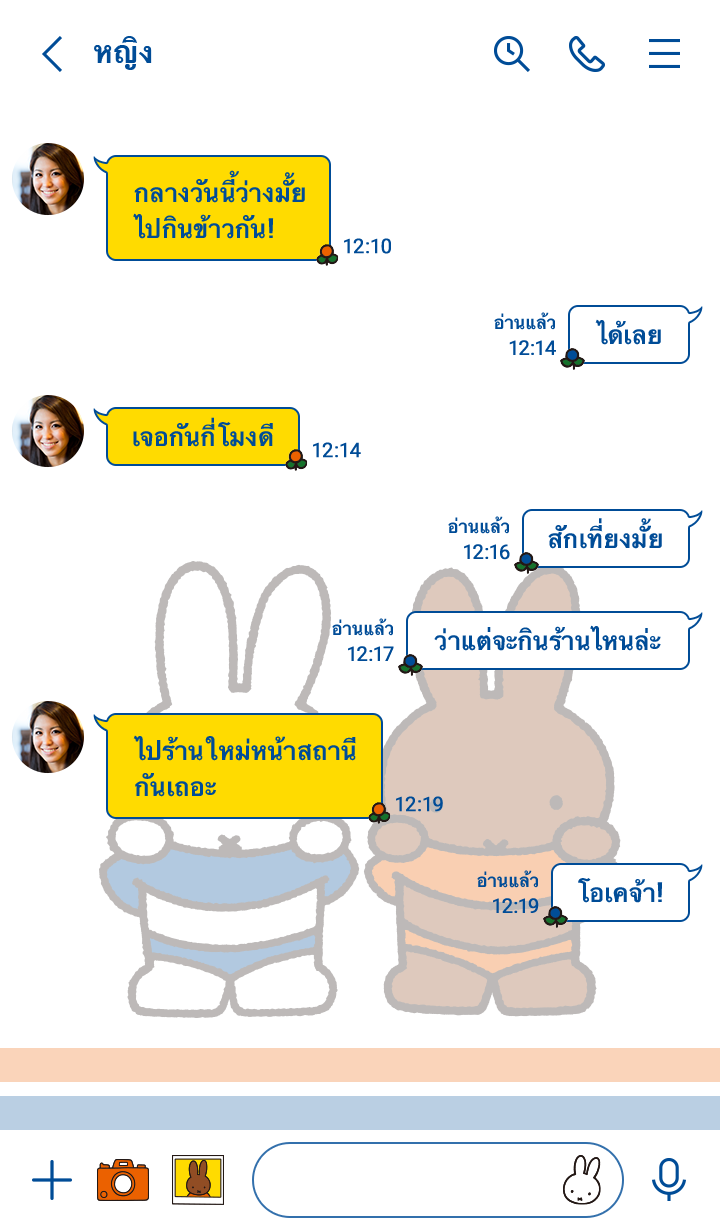 ธีมจาก miffy และ melanie ที่คุณจะอ่านแชทได้อย่างง่ายดายบนหน้าจอสีขาว (จะมีการอัพเดตธีมเป็นระยะจนถึง 180 วันหลังสิ้นสุดการจำหน่าย)