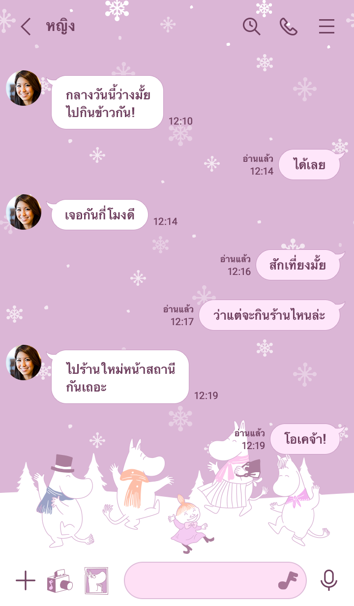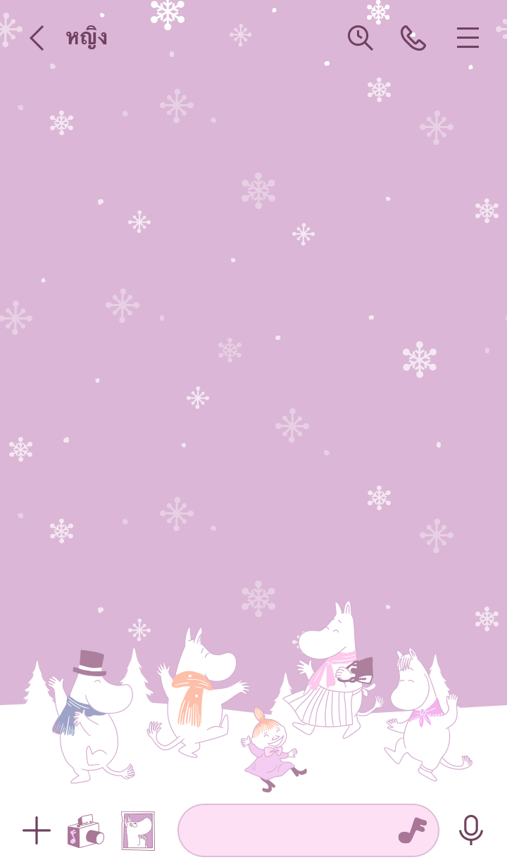 ธีมสุดน่ารักของมูมินและเพื่อนๆ ที่พากันดีใจเมื่อเห็นหิมะโปรยปรายในฤดูหนาว แชทให้สนุกสุดใจกันได้เลย♪ (จะมีการอัพเดตธีมเป็นระยะจนถึง 180 วันหลังสิ้นสุดการจำหน่าย)
