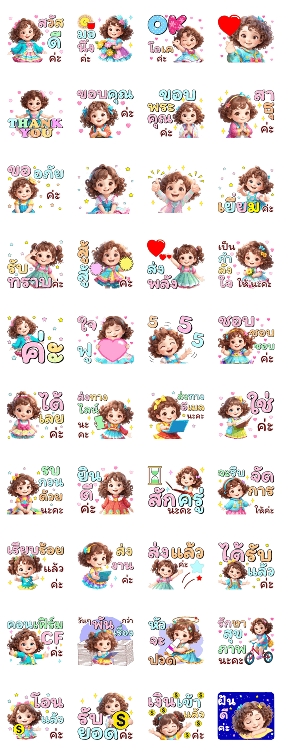 Comment: SuperCute Girl WORK & Daily Chats (Thai) by PeakStudio. Lovely Curly Hair Girl Big Cute Pastel Words: For everyday WORK: office, online, sales, coordinating errand & business to bring daily success to business owner.